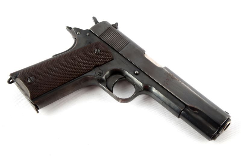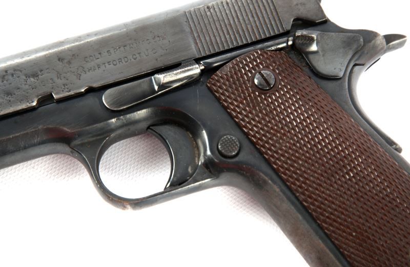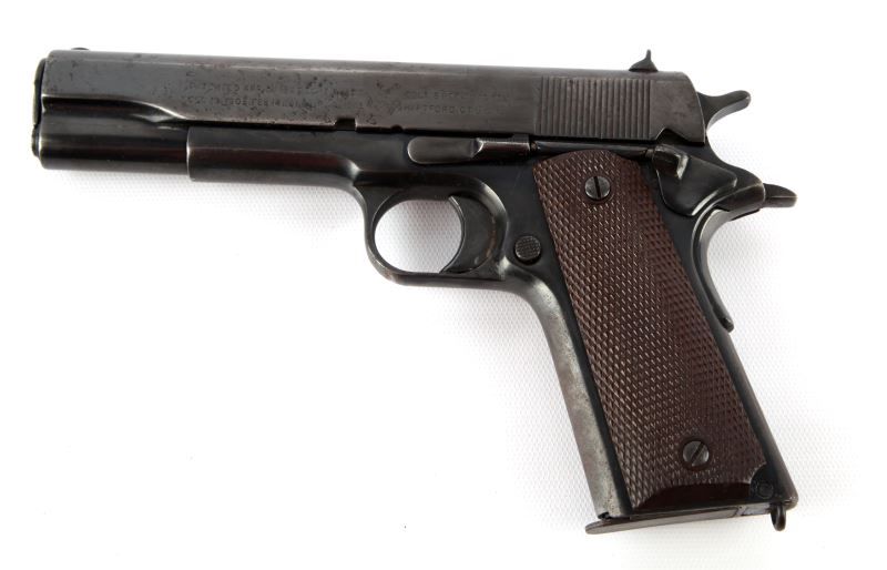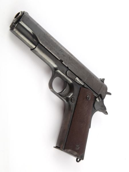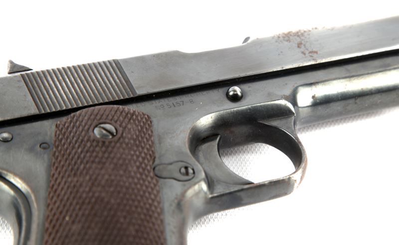 Colt Model 1911 pistol, marked "UNITED STATES PROPERTY" and manufactured in 1918. Significant pitting on left of slide. Bore is fair, but serviceable, with some rough spots. Finish is re-blued, with about 80% coverage. Overall fair condition, but good as a shooter. Caliber: .45 ACP Serial #: 515788