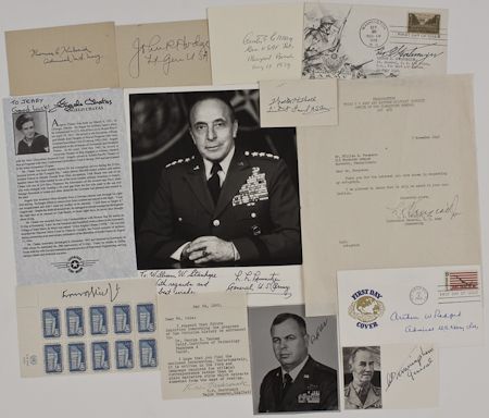 Good lot of 13 signed items, includes LUCIUS TRUSCOTT, T.L.S. 1p. 4to., Third Army Headquarters, Nov. 7, 1945, sends his autograph; Admiral THOMAS C. KINCAID bold signature and rank on a card; General GEORGE E. STRATEMEYER, signature on a first day cover honoring the Army; Pilot REX BARBER, small signed photo in uniform; D-Day Navy diver ANGELO CHATAS, signed biography; General LYMAN L. LEMNITZER, I.S.P. 8" x 10" b/w, in uniform; General WALTON H. WALKER, signature and rank on a small card; Admiral ROBERT B. CARNEY, signature on a block of UN stamps; Gen. CURTIS LE MAY, signature and rank on a card, 1979; General ROBERT W. HASBROUCK, brief T.L.S., 1952; General ARTHUR RADFORD, signature on a first day cover; British Gen. ALAN G. CUNNINGHAM, signature beside a small printed portrait; and General JOHN R. HODGE, signature and rank on a card. 13 pieces, overall fine.
