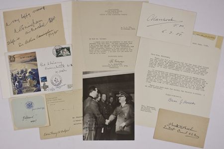 Good lot of nine signed items, includes: British Field Marshal ALAN BROOKE, signature on a card; General WALTON H. WALKER, signature and rank on a card; British General BRIAN HORROCKS, T.L.S., 1963 re: his programs on the BBC "Tunes of Glory" series; British General ARTHUR CONINGHAM, scarce signature with rank, 1945; General ALBERT C. WEDEMEYER, war-date T.L.S. , 1p. 4to., [China], declines to send a souvenir; General COURTNEY HODGES, war-date censoring signature on an envelope, Nov. 5, 1944; RAF Air Marshal JOHN C. SLESSOR, signature on a card, 1951; British golfer and French Resistance hero PAT CHERAMY, signature on a commemorative cover, also signed by an RAF flyer she rescued; and Hitler's person aide, RICHARD SCHULT KOSSINS, I.S.P. signed recto and verso.