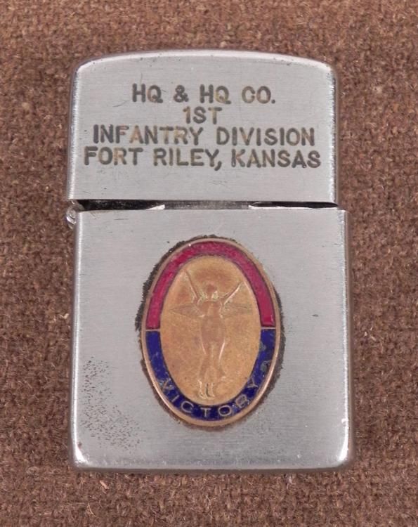 MILITARY LIGHTER-ENGRAVED "HQ &HQ Co-1ST INF DIV-FORT RILEY, KANSAS-W/ENAMEL INSIGNIA * * BOTTOM MARKED "WELLINGTON WINDPROOF" *