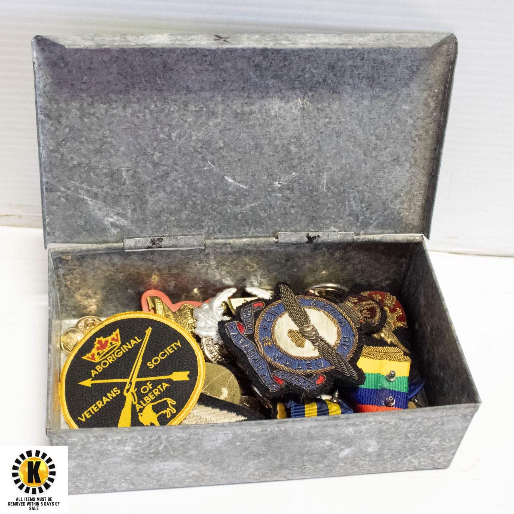 MILITARY MEDALS/BUTTONS/PATCHES- TIN LOT