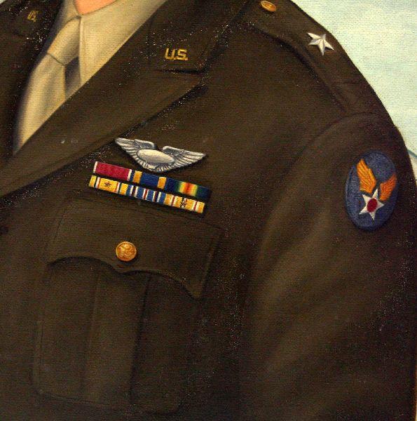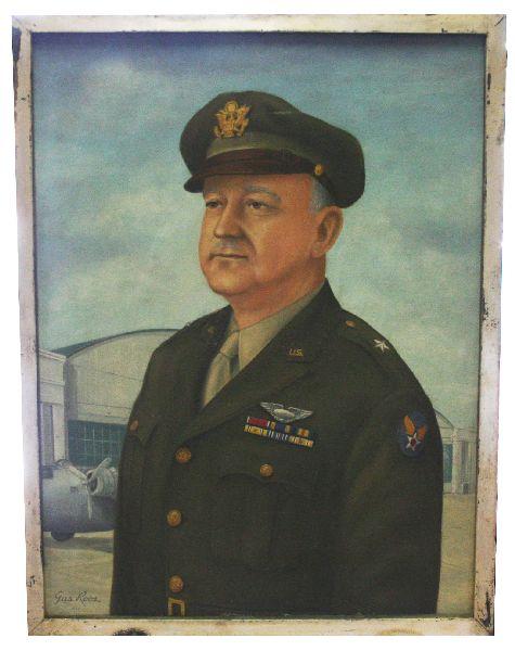 A 26X34 inch portrait on slate with a metal frame of a unknown Brigadier General wearing Blimp Pilot wings and additional decorations. Signed Gus Roos 1945. Image bears a likeness to General Rush Lincoln however in 1945 Lincoln was a Major General. very good condition.
