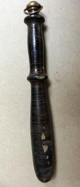 THIS IS A MILITARY/POLICE HIGH QUALITY BILLY CLUB-11 1/2". THE BILLY CLUB IS TORPEDO SHAPED -LAYERED CONSTRUCTION--ROUNDED BRASS BOPPOM TIP--TOP IS BRASS WITH HANGER SWIVEL.
