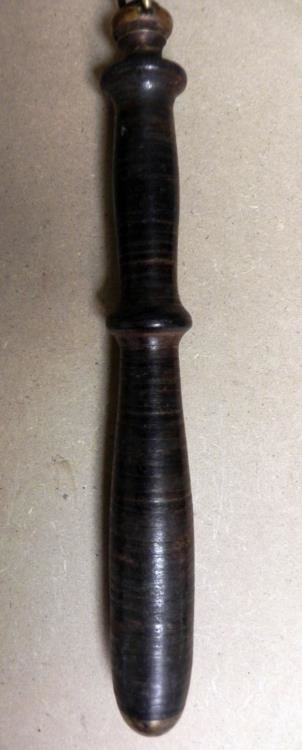 THIS IS A MILITARY/POLICE HIGH QUALITY BILLY CLUB-11 1/2". THE BILLY CLUB IS TORPEDO SHAPED -LAYERED CONSTRUCTION--ROUNDED BRASS BOPPOM TIP--TOP IS BRASS WITH HANGER SWIVEL.