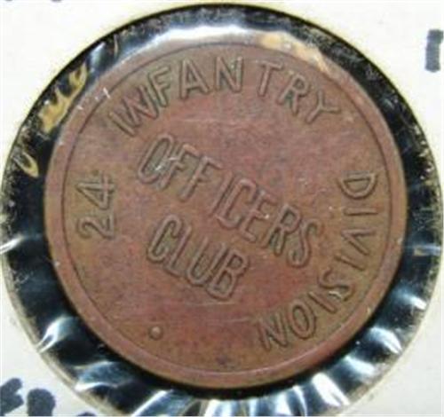 MILITARY TOKEN. Marked “24 Infantry Division/Officer’s Club” and “Seeburg Juke Box/Japan” on reverse.