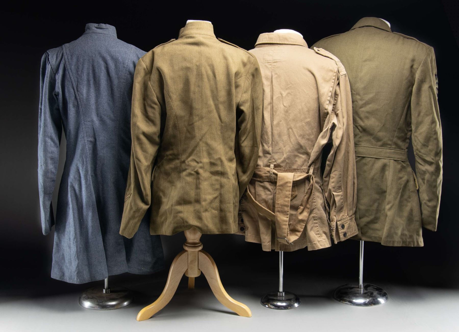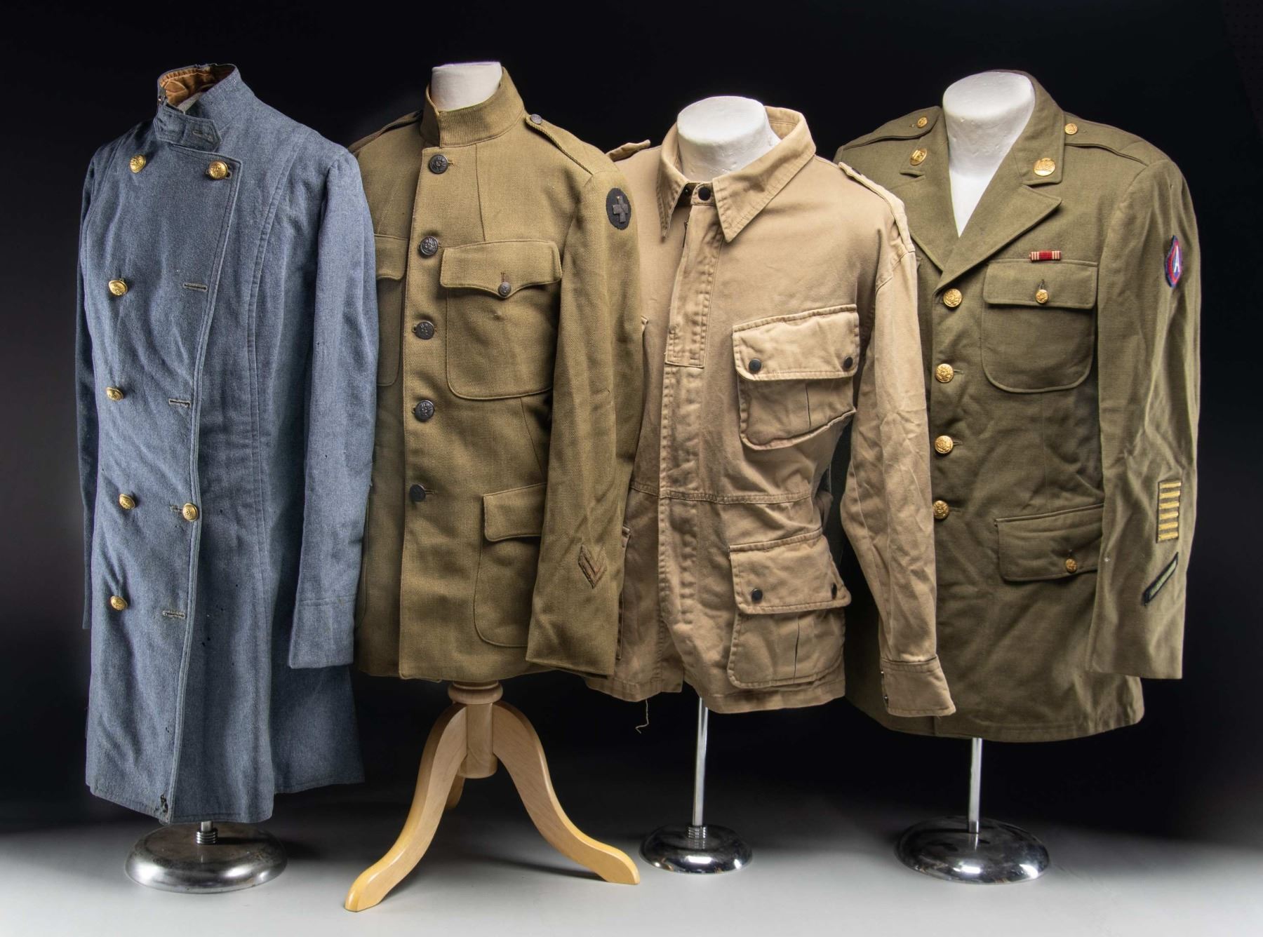 This fine uniform lot consists of 1 WWI US tunic with a 33rd Infantry division patch on the left shoulder and 2 service chevrons on the left sleeve. There is a WWI victory medal included that has become detached from its bar. / 1 Reproduction M1942 parachute jump coat by Avirex. / 1 Virginia 1880-1900 uniform coat in blue/gray wool with a double breasted 10 button front (7 present). Buttons are late 19th century with " HORSTMANN * PHILADELPHIA * " backmarks. / 1 WWII dress uniform coat for a Technical Sergeant of the 3rd Army. / 1 Identified US Army regulation blanket. CONDITION: all items show light wear and some have light moth damage.(02-24142/BF). NON-GUN. $300-500.