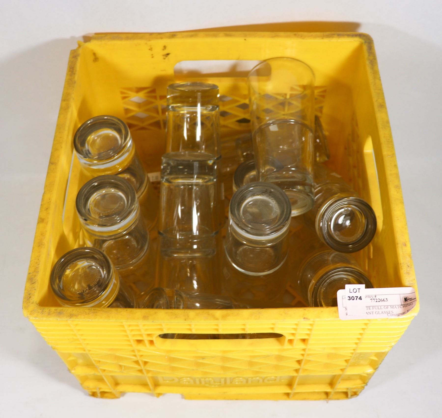 MILK CRATE FULL OF MATCHING RESTAURANT GLASSES