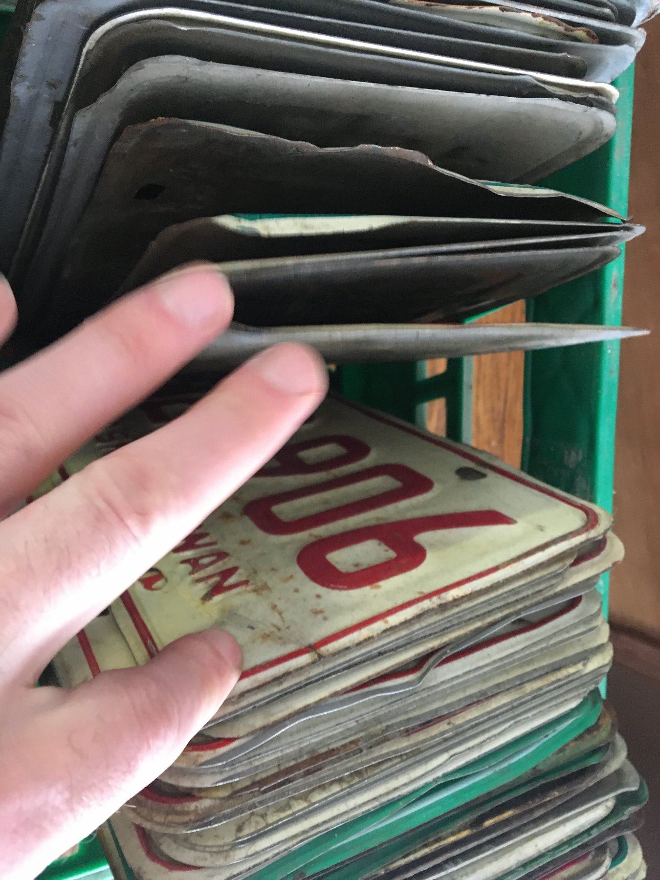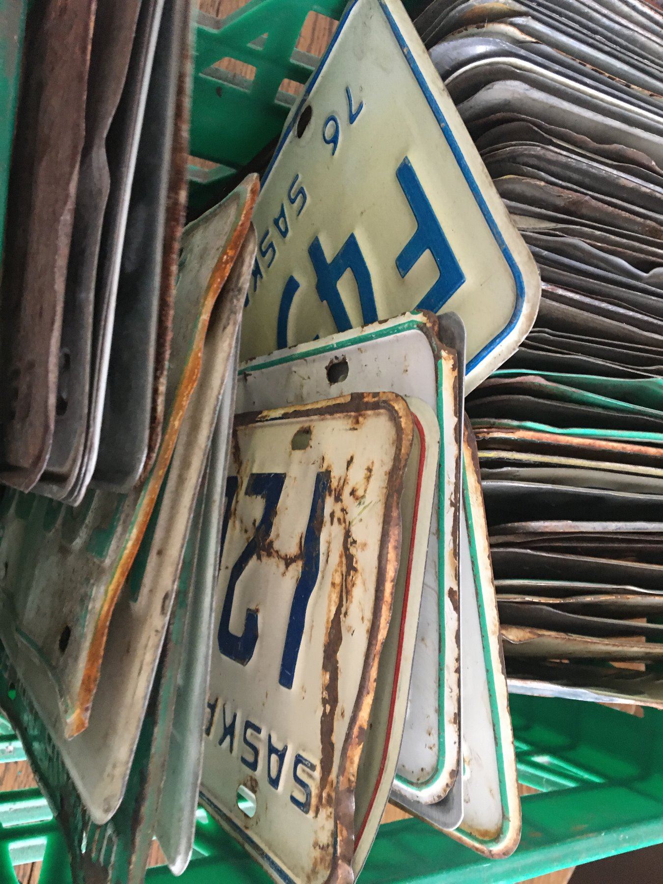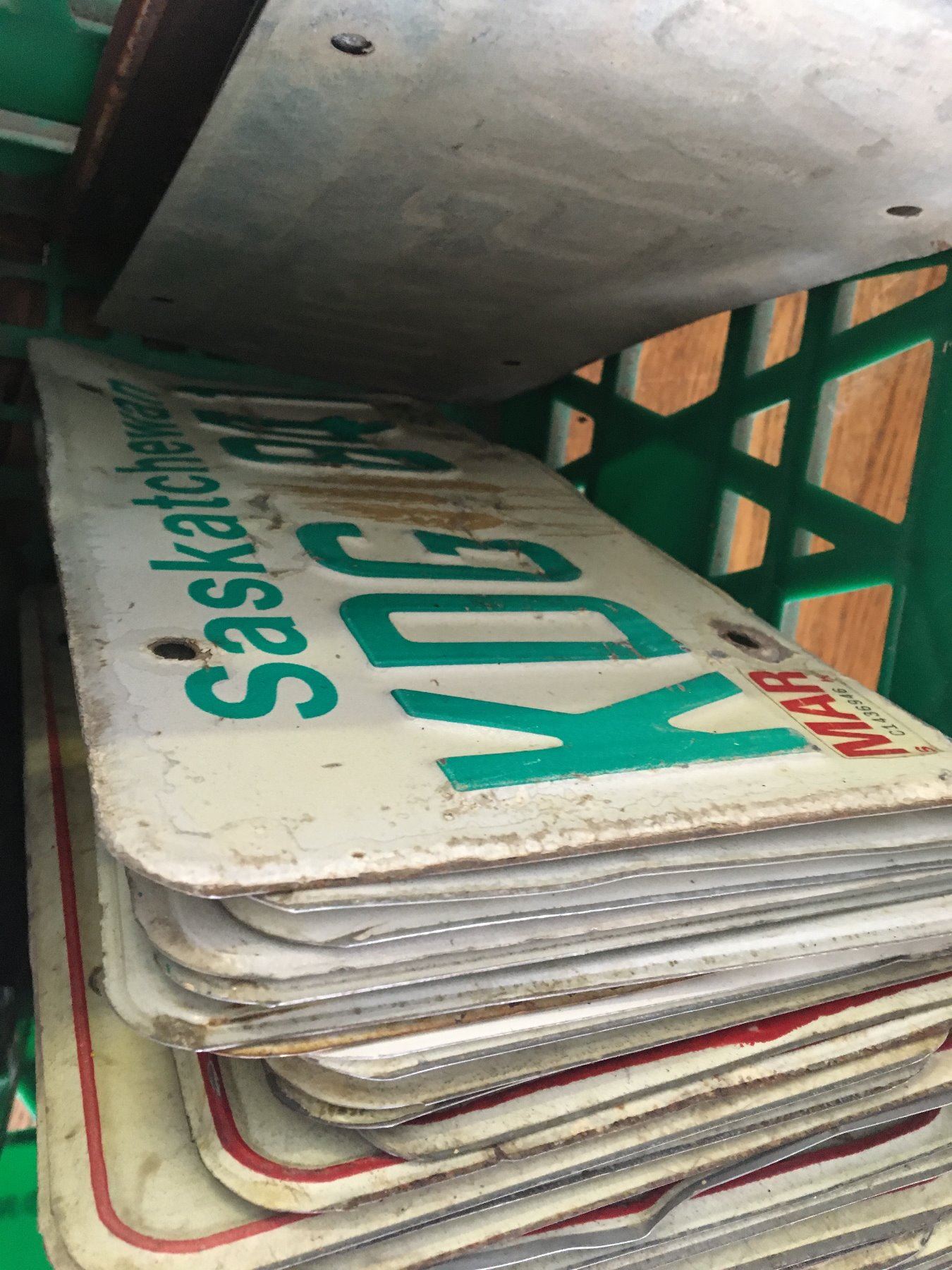 MILK CRATE OF LICENCE PLATES MOSTLY SASK