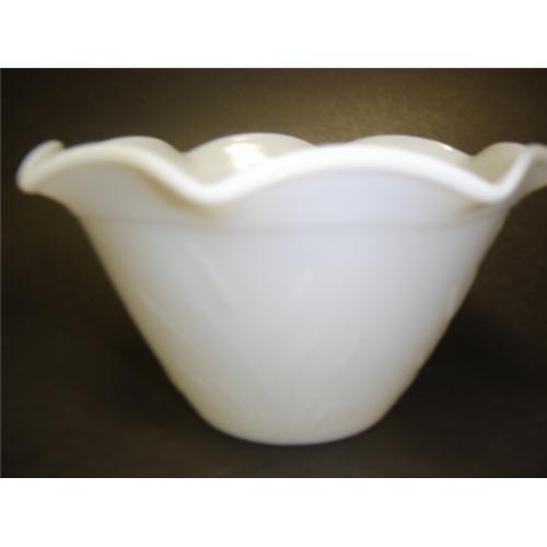 RUFFLED MILK GLASS BOWL. IT IS 5 INCHES HIGH AND 7 1/2 INCHES ACROSS ON TOP RIM. WHEAT DESIGN ON THE SIDES.