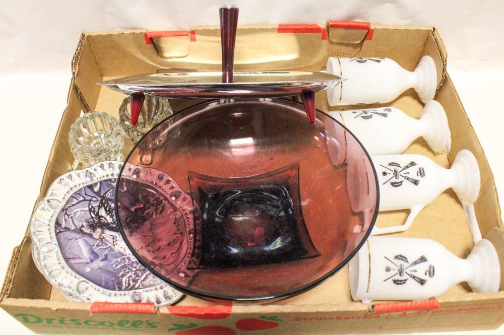 SILVERTONE TRAY AND ASSORTED GLASS