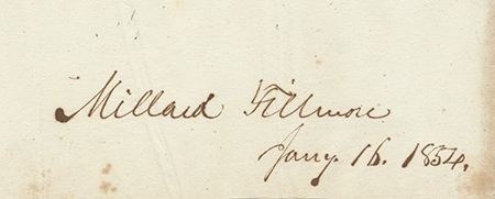 (1800 - 1874) Thirteenth President of the United States who succeeded to the presidency upon the death of Taylor. Very bold, 4 1/2" signature adding "Jany. 16, 1854", penned on a sheet. Mounted, very good.