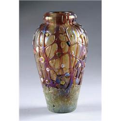 Lot 72 MILLEFIORI VASE Very unusual vase has green confetti colored glass at bottom with stylized vines rising upwards and inlays of millefiori flowers encircling the vase. The stylized vines have blue and purple iridescence and stand out against the amber colored background. SIZE: 11” t. CONDITION: Very good to excellent. 5-70257