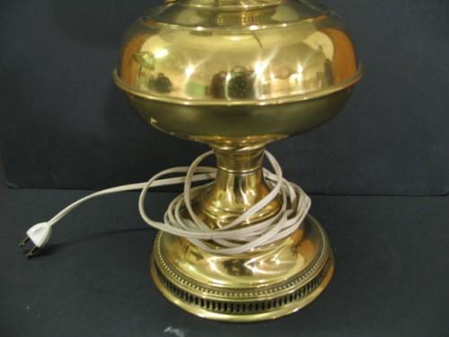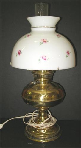 MILLER BRASS TABLE LAMP. Electrified. Floral and gilt decorated white glass shade. Minor denting to brass base. Marked “Miller” on oil cap. Minor flaking to bottom edge of shade. 20.75” H to top of chimney.