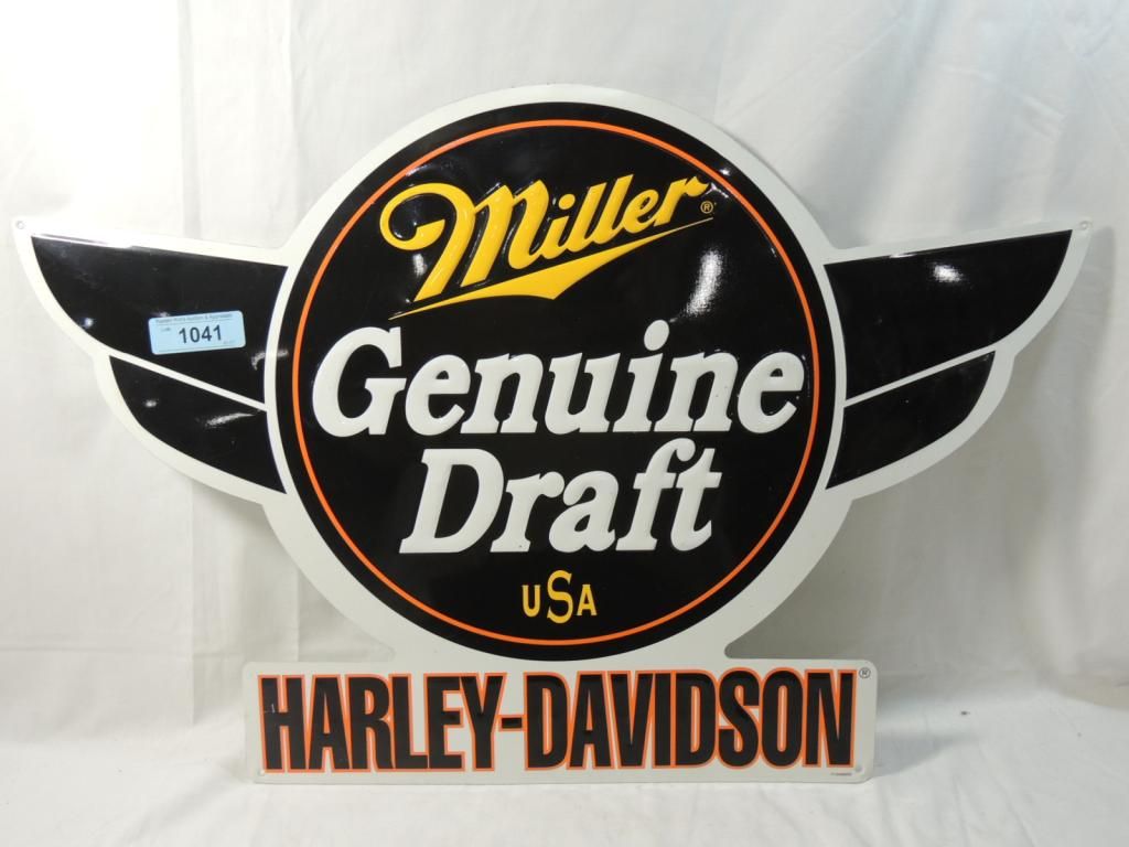 HARLEY DAVIDSON MILLER GENUINE DRAFT TIN SIGN. WALL SIGN. BREWERIANA AS SHOWN SEE PHOTO FOR MORE DETAILS.