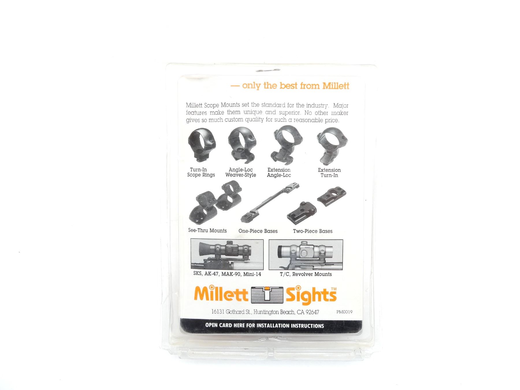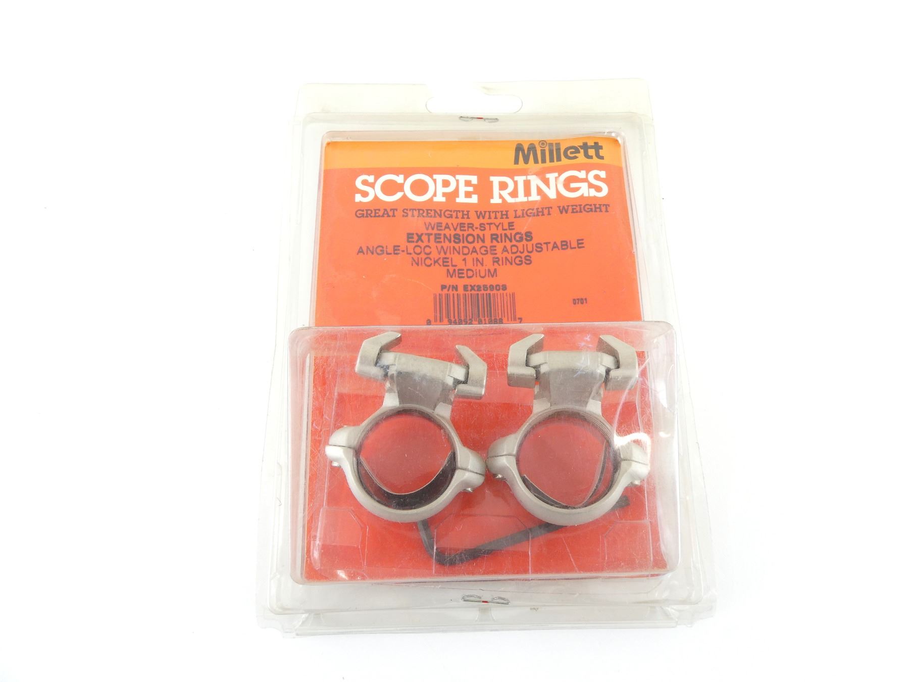 (1) SET OF SCOPE RINGS, PACKAGE MARKED: "MILLET SCOPE RINGS, WEAVER-STYLE, EXTENSION RINGS, ANGLE-LOC WINDAGE ADJUSTABLE, NICKEL, 1 IN. RINGS, MEDIUM", WITH ORIGINAL PACKAGING. SEE PHOTOS.