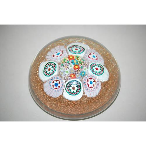 MILLIFIORE ART GLASS PAPERWEIGHT - 4" MILLIFIORE GLASS<BR>PAPERWEIGHT W/ BROKEN CANE & GOLDSTONE DESIGNS-MAKER<BR>UNKNOWN (PROBABLY ITALIAN) - WEAR