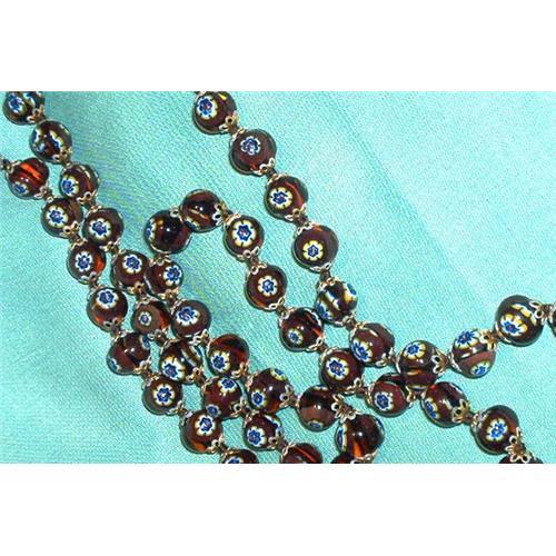 MILLIFLORE VENETIAN BEADS/VINTAGE These flapper length (45 inches)beads are superb. The beads against the window have an amber color. The process for doing the flower designs, creates a different appearance on the beads and they look a little chocolate brown. I have rarely seen beads this length in this style. They are awesome. This is a vintage item and would make a very unusual gift.