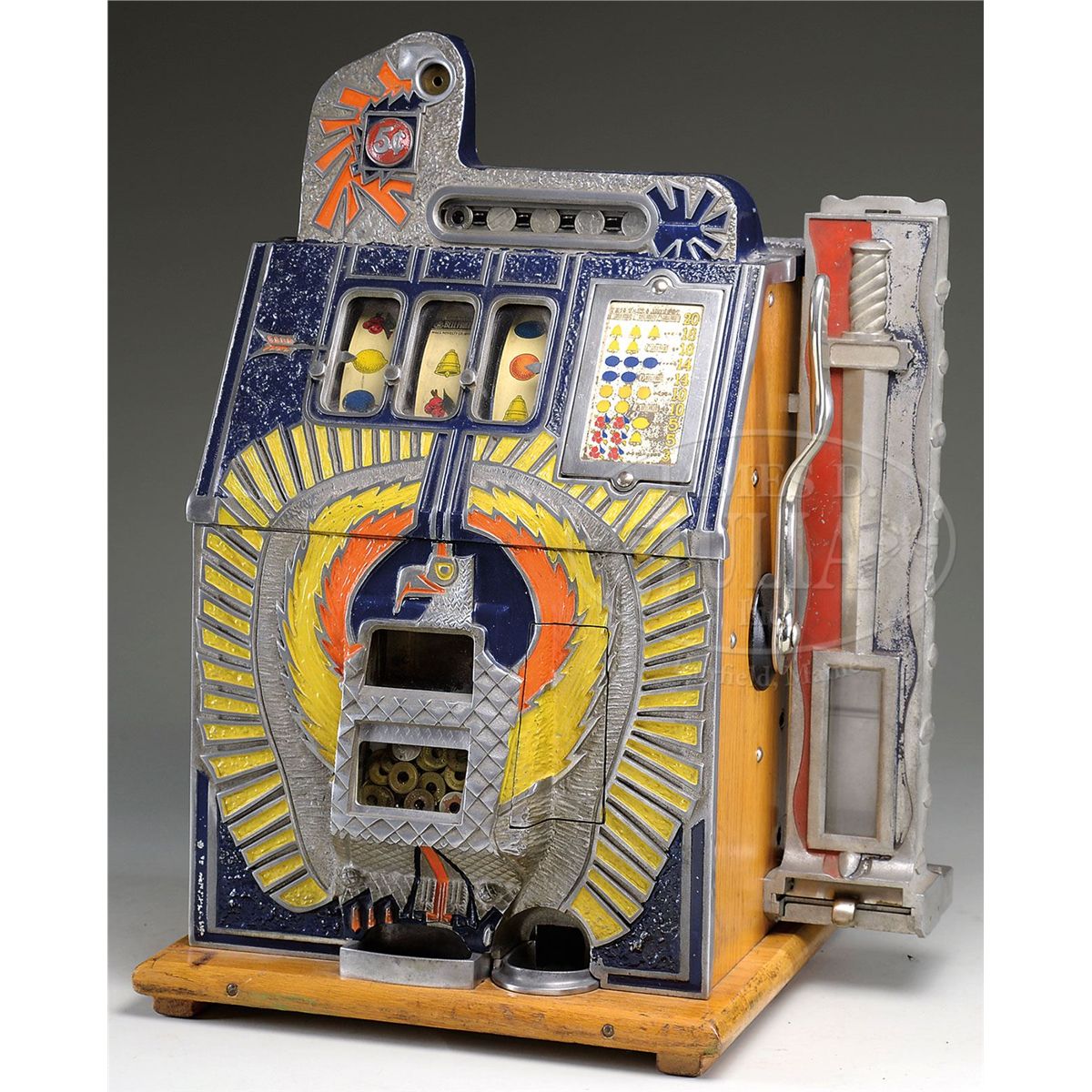 A classic machine from the 1930s Silent Mystery Series. Fanciful aluminum castings depicting an eagle on the front of the machine make this a most appealing and visually attractive gambling device. Often times manufacturers changed or upgraded the front of their machines to catch the eye of the perspective gambler. An added feature to this desirable slot machine is the side vendor (lacking trip lever), which allowed the operator to circumvent gambling laws by dispensing a roll of mints every time the machine was played. A nice clean original machine with aged repainting to front casting, all castings intact without cracks, chips, etc. Machine retains its original cash box, working jackpot backdoor with Mills key and original reel strips. A nice clean machine the way it is or if you prefer a good candidate for restoration. SIZE: 16" w (not including side vendor) x 15" d x 26" t. CONDITION: As stated above. 1-13500