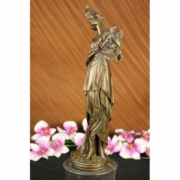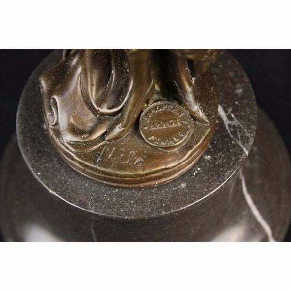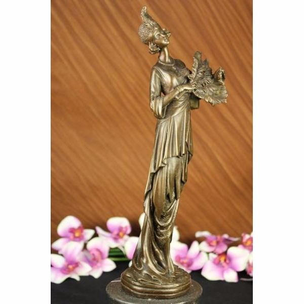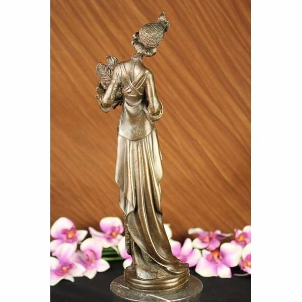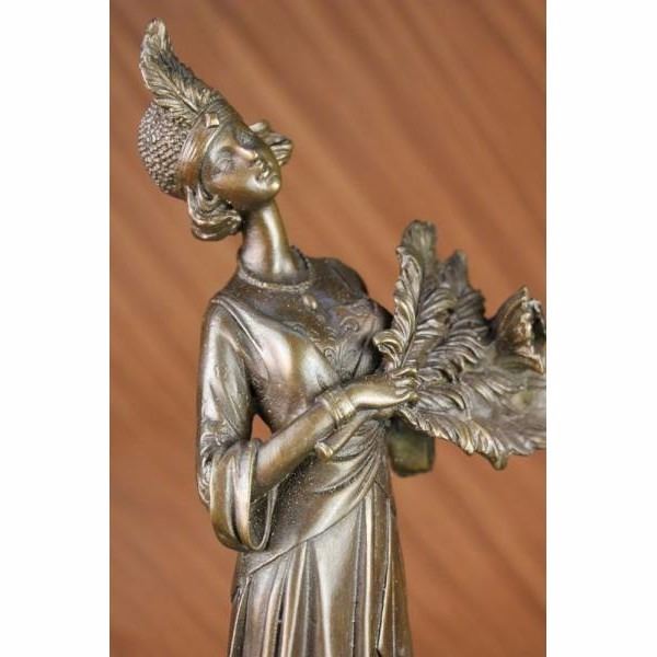 This unique sculpture of a 1920's woman with four feathers in her right hand standing proudly for the silent era. Her unforgettable dress that drops all the way to the floor from the back, while the front shoes some legs and has so many pretty layer to it. The details on the neck-less, bracelet, and Charleston head band are unbelievably carved perfectly. This is a beautiful bronze sculpture cast using the "Lost Wax Method" and has a gorgeous brown patina. It is mounted on a marble base and is 100% bronze and handmade. This sculpture is signed by the artist Milo. Condition: This sculpture is in perfect condition. Bronze Dimensions with Marble Base:Height 16" x Width 6" Marble Dimensions: Diameter 6" Height without base: 12 1/2" Weight : 10 LBS Inventory:13X10533531