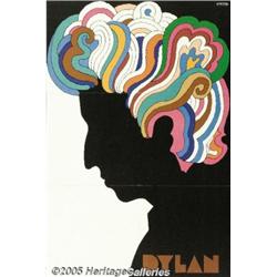 <B>Dylan by Glaser (Circa 1966)</B></I> Advertising Poster (22" X 33"). Note: this is the original 1966 printing. The current reproduction being sold by the Glaser studio is 15.5" X 23" on a 24" X 36" sheet of paper. This is a full bleed poster with no border. Milton Glaser (co-founder with Seymour Chwast of Push Pin Studios ) is a giant among American illustrators. He has created some of the iconic images of the last 40 years, working in every print medium from posters to menus for an entire New York restaurant he created. This famed psychedelic design was included with a 1966 Dylan album "Greatest Hits-Volume 1" and was immediately taped to thousands of dorm room walls. Only a scattered few have survived intact. This example is original condition, unrestored. Very Fine+.