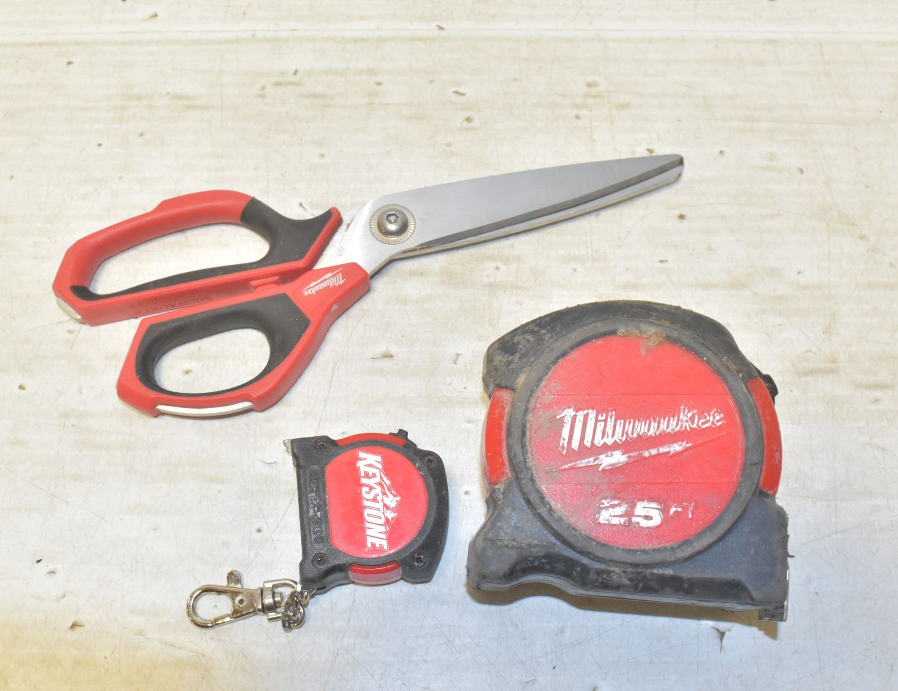 MILWAUKEE JOBSITE SCISSORS AND 2 TAPE MEASURES