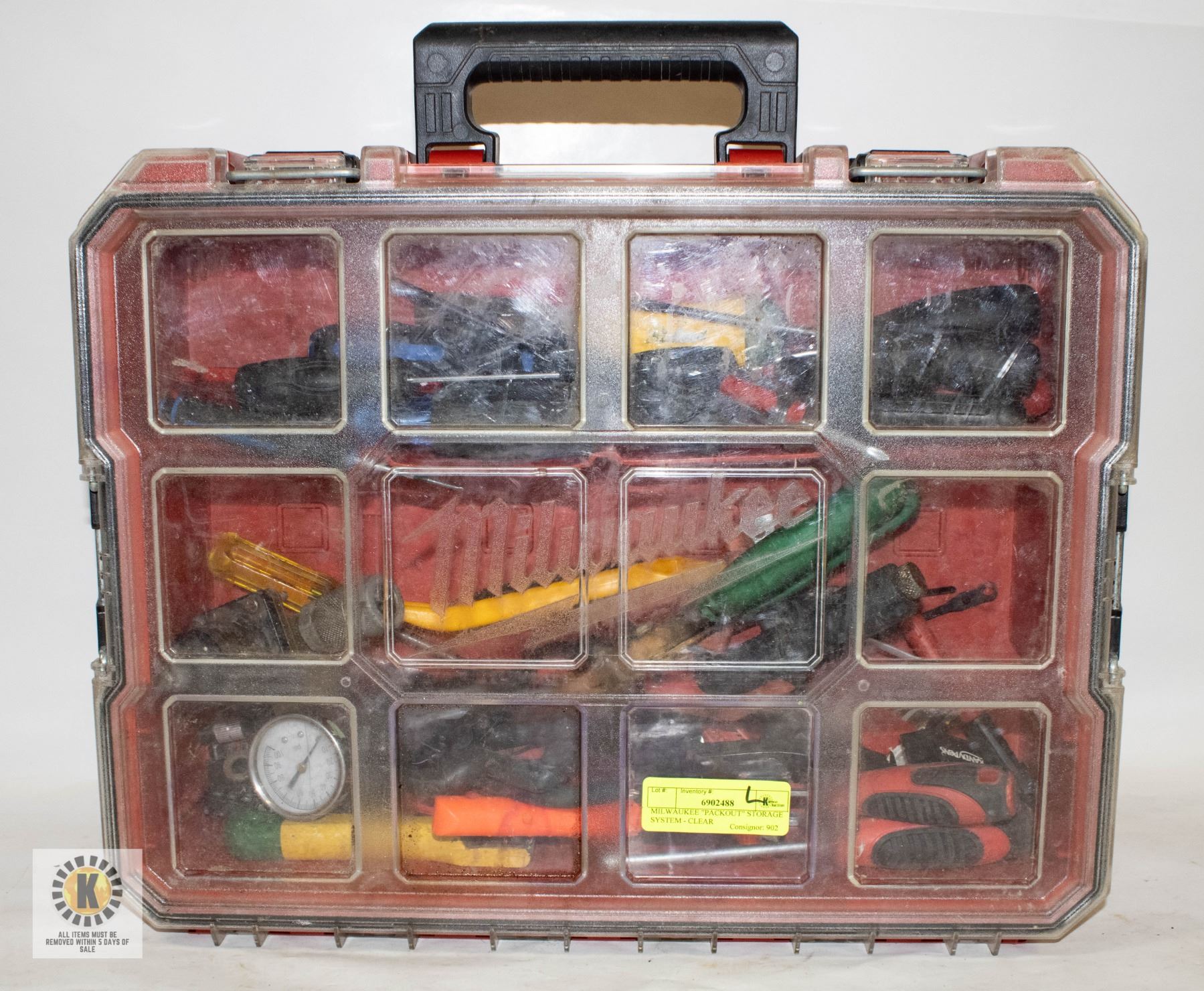 TOP ORGANIZER, 2-COMPARTMENT CLAMP-DOWN BOX WITH ASSORTMENT OF TOOLS - CLIP DESIGN WORKS WITH PACKOUT SYSTEMS (20" X 15" X 5") **ALL ITEMS MUST BE REMOVED BY 5PM SATURDAY, APRIL 12TH 2025. ALL REMAINING ITEMS WILL BE SUBJECT TO A $6.00 PER DAY STORAGE CHARGE. ANY ITEMS REMAINING AFTER MONDAY, APRIL 28TH 2025 WILL BE CONSIDERED FORFEITED. NO REFUNDS WILL BE ISSUED FOR FORFEITED ITEMS. TO SCHEDULE A PICK UP APPOINTMENT CLICK HERE