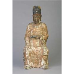 Large, Chinese Ming Dynasty, polychrome stucco on carved wood figure of a seated scholar (flaws); H: 32 3/4"