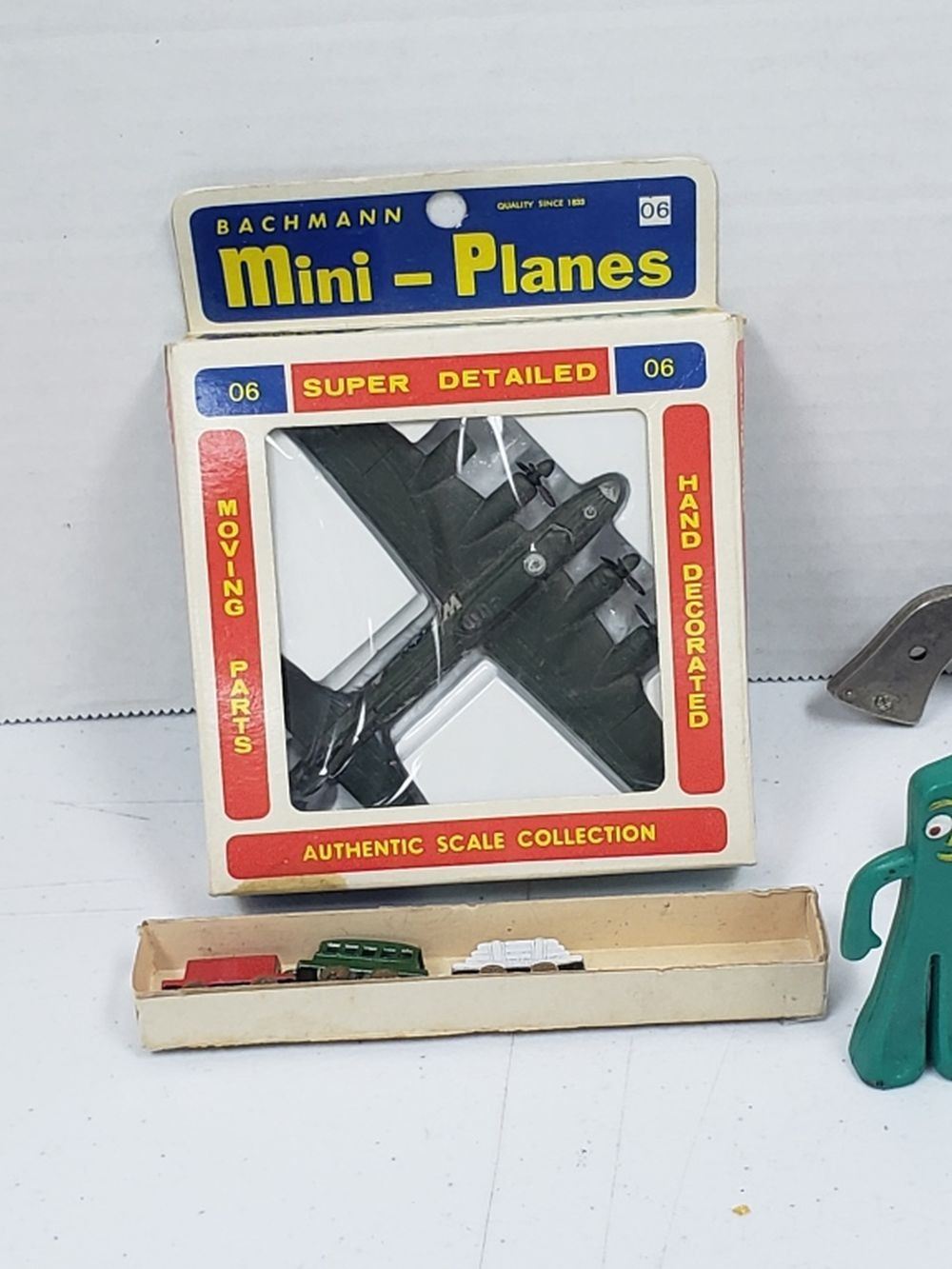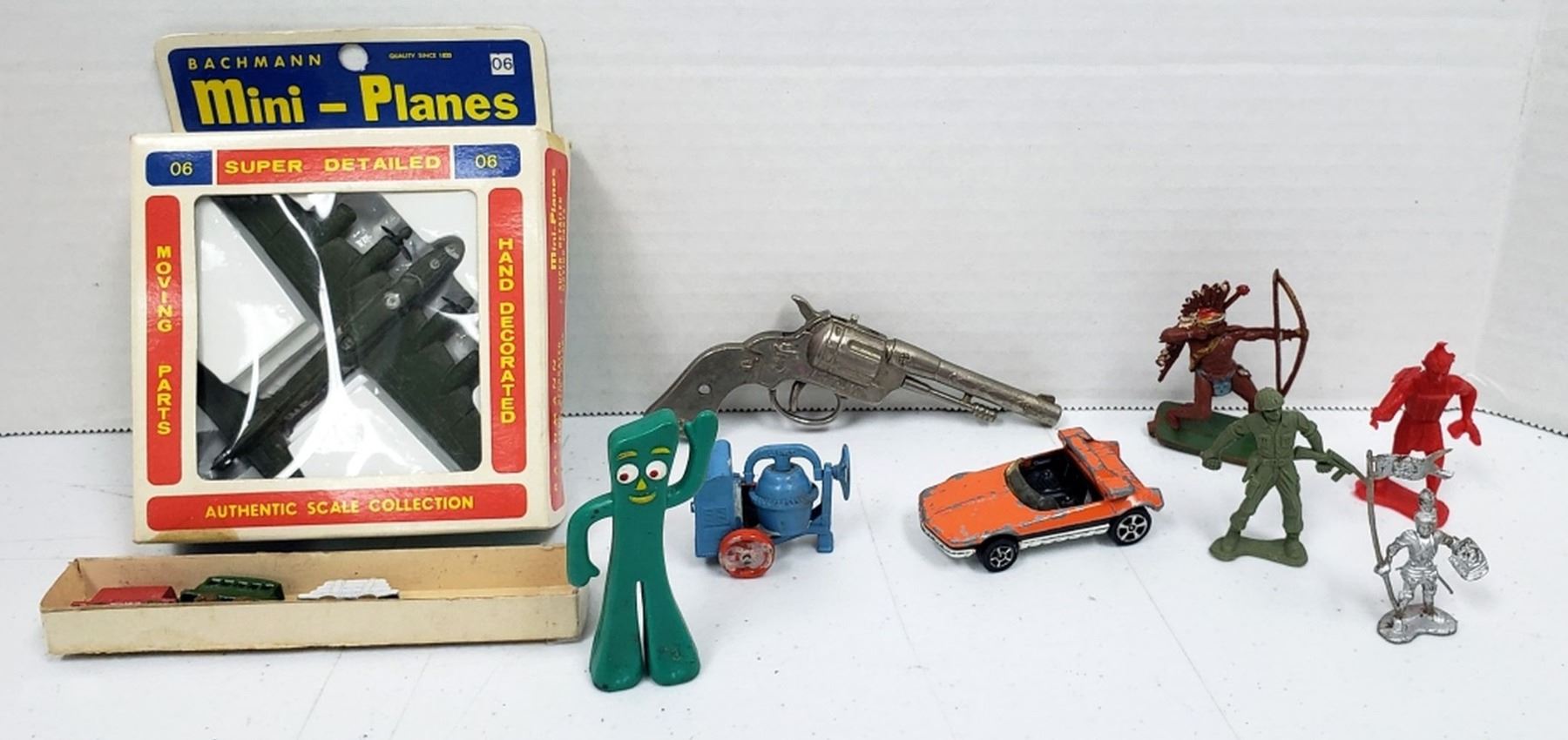 BACHMANN MINI PLANES in BOX, MINI JAPAN TOY TRAIN CARS (MISSING ENGINE), MINI RAYO GUN, BERTONE WHIZZWHEELS CAR, 2-PLASTIC INDIANS, PLASTIC SOLDER & GUMBY
