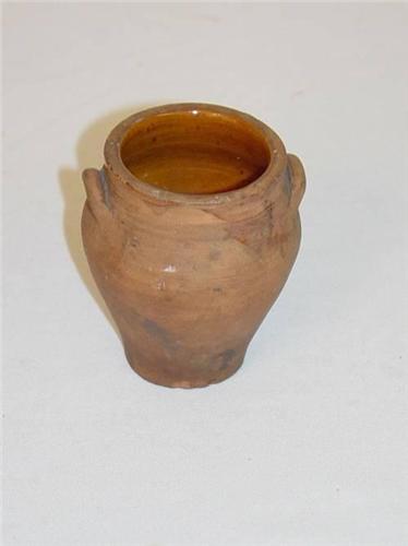 MINIATURE 3 1/2" NEW ENGLAND REDWARE HANDLED JAR- UNGLAZED EXTERIOR & GLAZED INTERIOR - SMALL BASE RIM CHIPS;