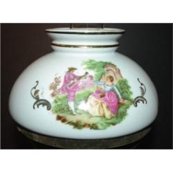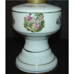 Miniature transfer decorated Aladdin style china lamp. Decorated with courting scene. 11" H