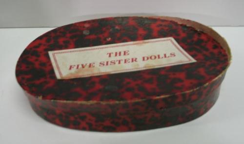 SET OF FIVE MINIATURE BISQUE DOLLS IN ORIGINAL BOX. Box is marked “The Five Sister Dolls”. The five miniature dolls depict females in different colored dresses with movable arms. All dolls are marked on bottom “Japan”. Box shows signs of wear and damage. Box measures 8” L.