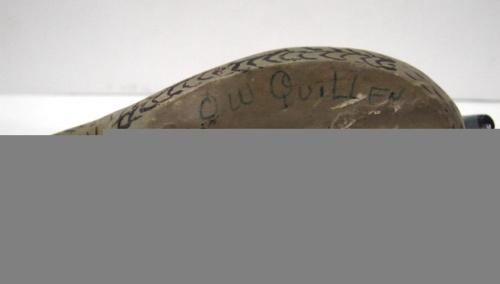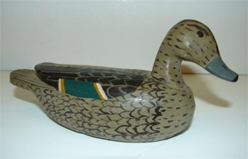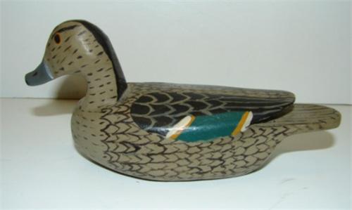 MINIATURE BLACK DUCK DECOY. Signed on bottom “O.W. Quillen/Chincoteague, Va.” 5” L