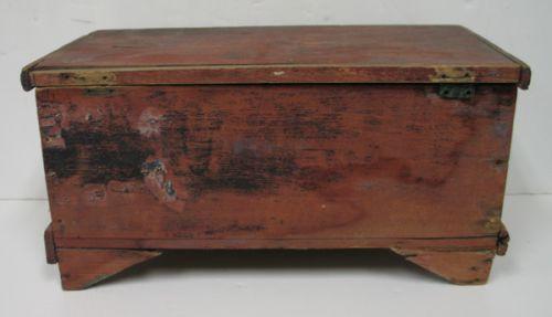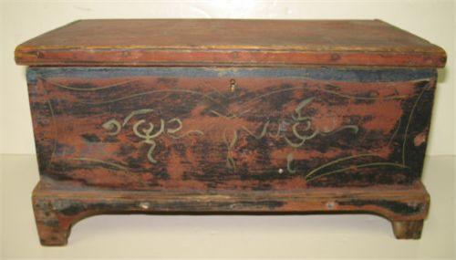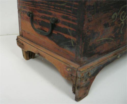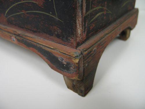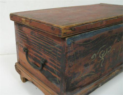 MINIATURE PAINT DECORATED BLANKET CHEST. Retains original black, blue, & red paint. Hinges are worn and in need of replacing. Loss and damage to wood at feet. 8” H, 15” W, 7.75” D
