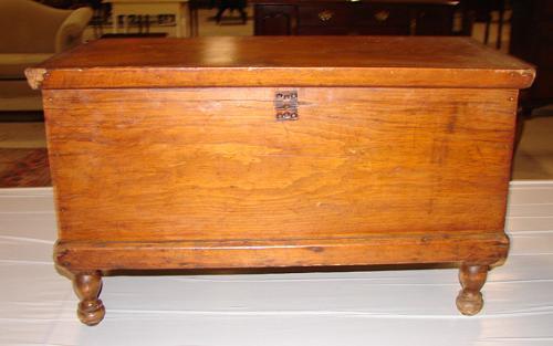 MINIATURE PINE BLANKET CHEST. Antique pine blanket chest with turned feet. Recently refinished. 18"H, 26"W, 12"D