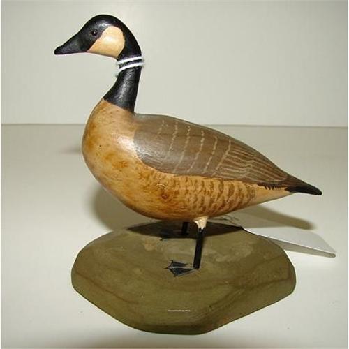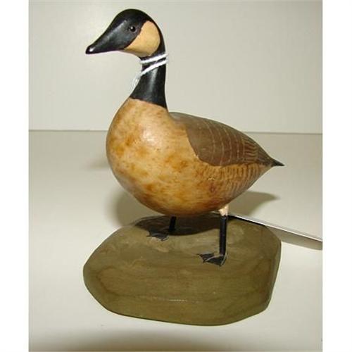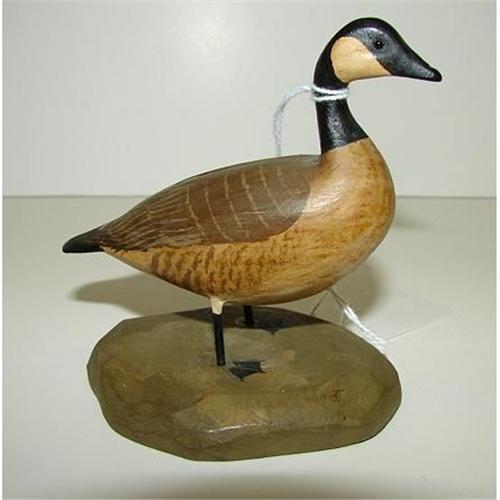 MINIATURE STANDING CANADA GOOSE CARVING. Depicts a standing Canada goose on wooden base. Marked on bottom of base “Made For/Abercrombie & Fitch/by George Winters”. 3.25” H
