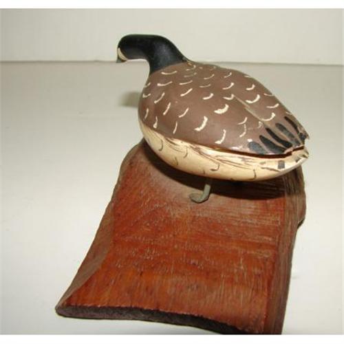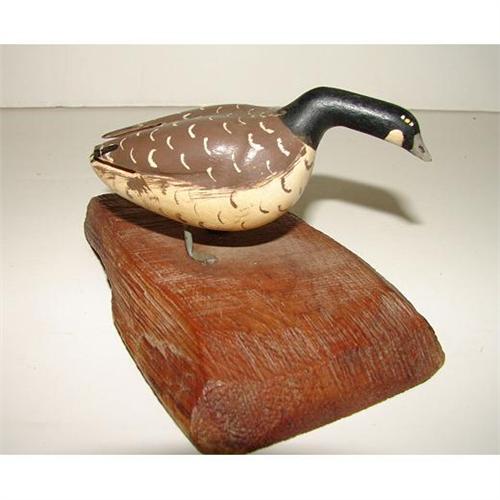 MINIATURE CANADA GOOSE CARVING. Depicts a standing Canada goose attached to a wooden base. Unsigned. 2.75” H, 5” L