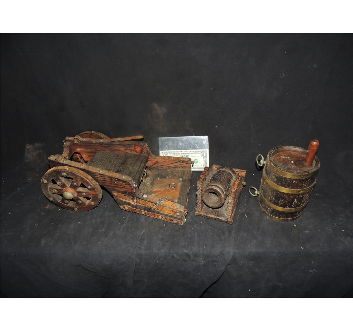 MINIATURE CANNON LOT VINTAGE WOODEN TOYS USED AS SET PIECES.
