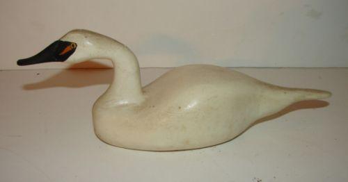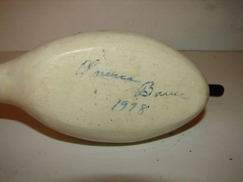 MINIATURE CLARENCE BARNES HISSING SWAN DECOY. Signed on bottom "Clarence Barnes/1978". 9.75" l