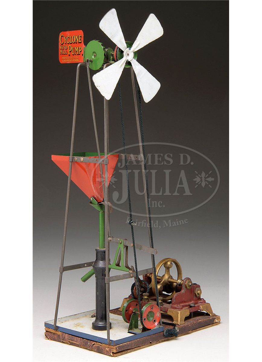 Tin windmill on derrick base with electromagnetic motor and hand crank back up to power the blades and pump. Lithographed tail identifies the Cyclone Windmill Pump and a patent date of February 27, 1917. SIZE: 16-1/2" h. CONDITION: Good to very good with replaced string. Tail has minor scratches. Paper litho on base is deteriorating. 1-13247