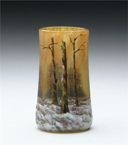 MINIATURE DAUM WINTER SCENE. Classic Daum winter scene design is done in cameo and enamel trees and snowy ground against a mottled orange and yellow background. Signed on the underside in black "Daum Nancy". SIZE: 2-1/2 in. t. CONDITION: Lip appears to have been ground, otherwise very good to excellent. 5-61276
