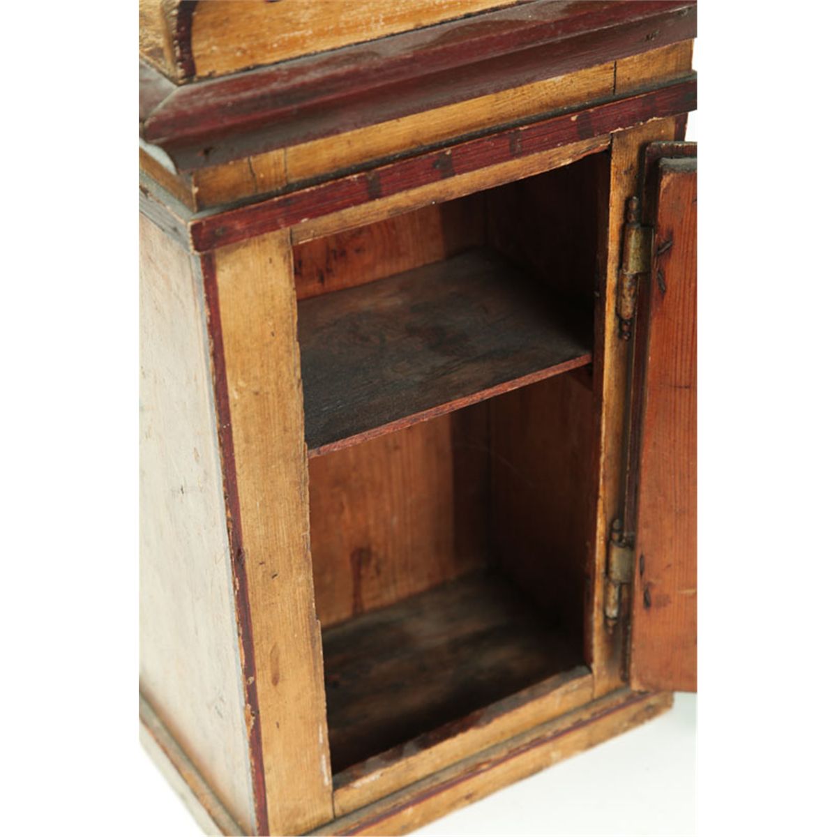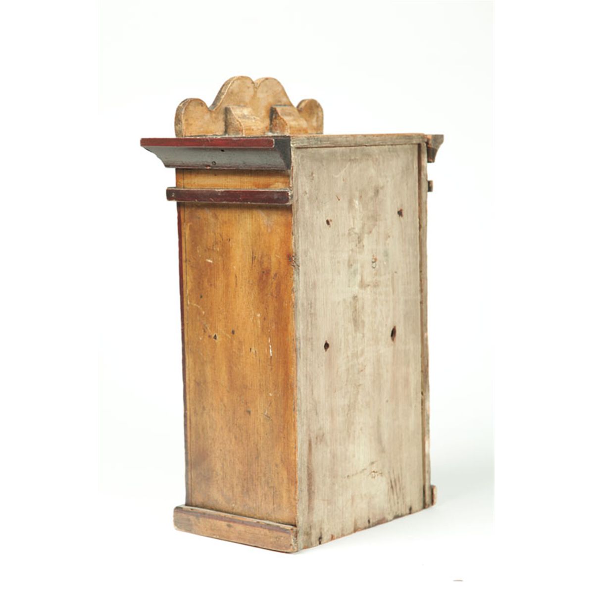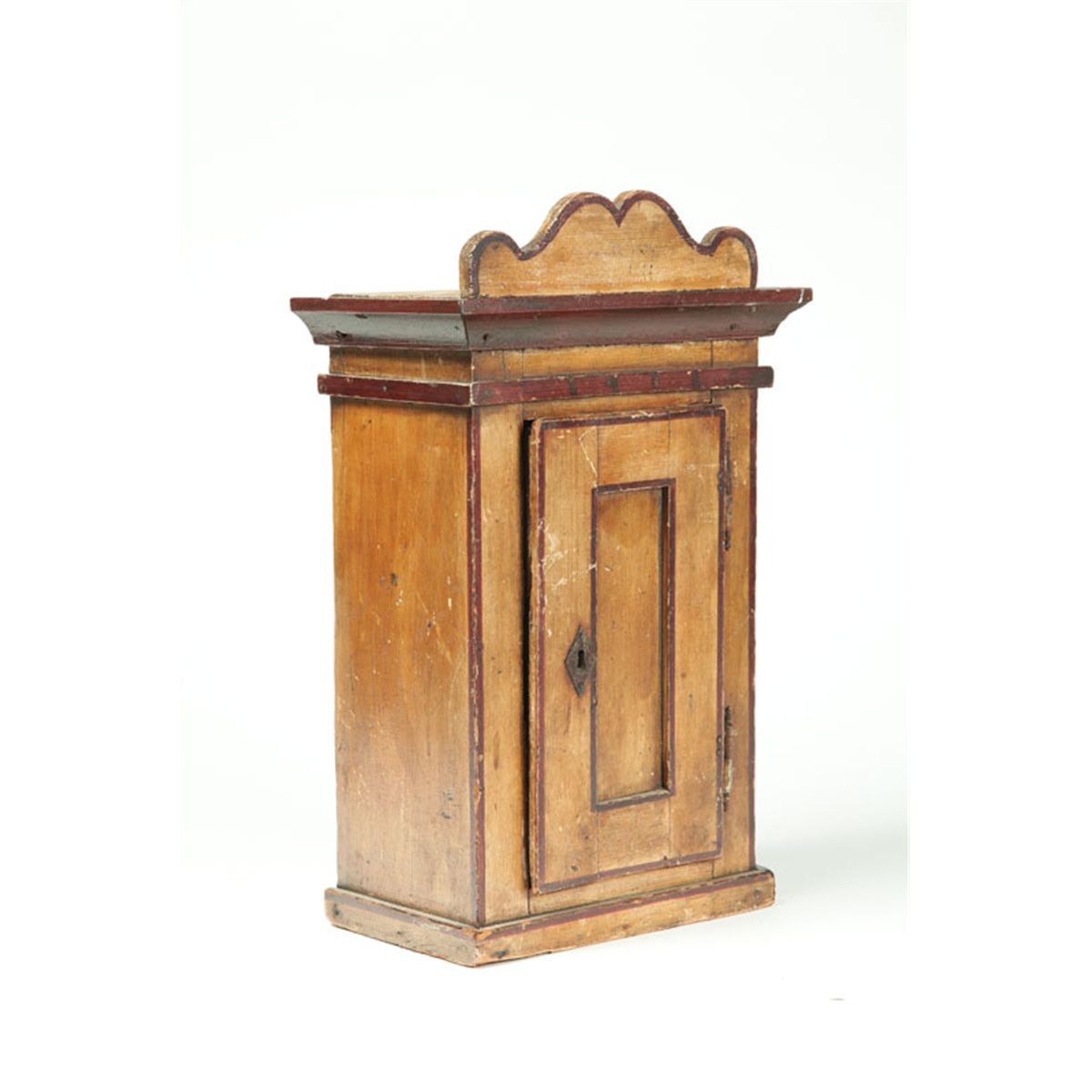 Pennsylvania or Plains Mennonite, 2nd half-19th century pine. Shaped crest, single paneled door, interior shelf, original lock, and original brown and mustard paint decoration. Pintle hinges.17 1/2"h. 10 1/2"w. 6 1/2"d. Ex Joyce Leiby (Pennsylvania).