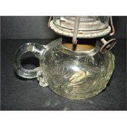 MINIATURE CLEAR GLASS FINGER LAMP. Base has embossed sun decoration. Burner knob does not operate. 7.5” H