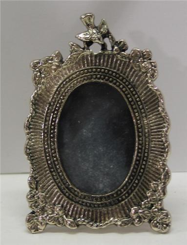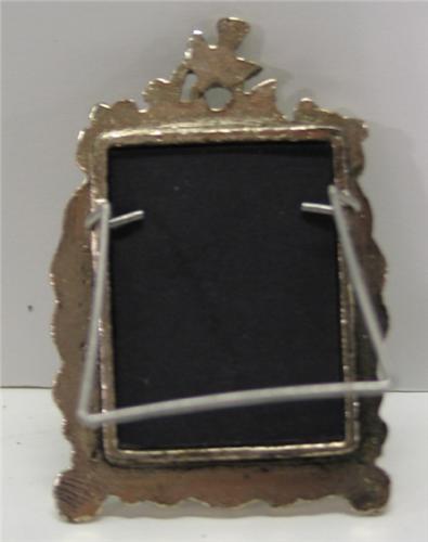 MINIATURE ORNATE SILVER PLATE FRAME. Ornately decorated with figural bird at top. No mark. 2.5” L