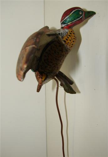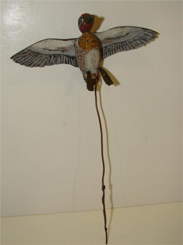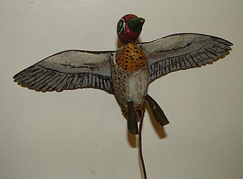 MINIATURE GREEN-WINGED TEAL FLYING DECOY. Unknown carver. Has attached copper wire stand with no base. Wingspan: 6"