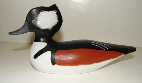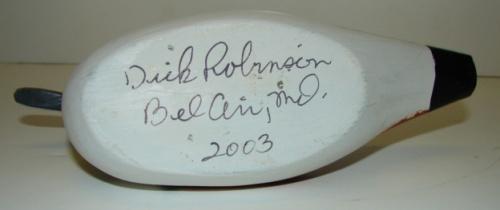 MINIATURE UPPER BAY, MARYLAND HOODED MERGANSER DRAKE DECOY. Signed on bottom “Dick Robinson/Bel Air, Md./2003”. 6.5” L