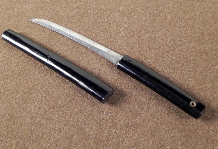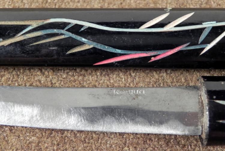 THIS IS A MINIATURE JAPANESE SAMURAI SWORD. IT HAS A LAQUERED GRIP & SCABBARD, WITH A SHARP BLADE. THE BLADE IS 5 1/2" LONG AND IS MARKED KORIUM JAPAN. THE OVERALL LENGTH IS 10". * * * *