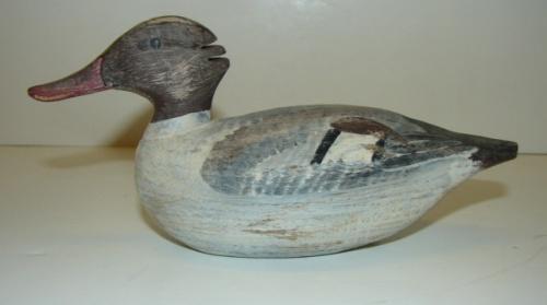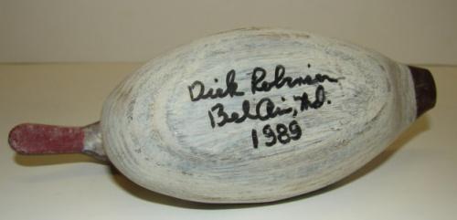 MINIATURE UPPER BAY, MARYLAND MERGANSER DECOY. Signed on bottom “Dick Robinson/Bel Air, Md./1989”. 6” L