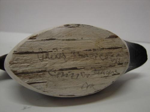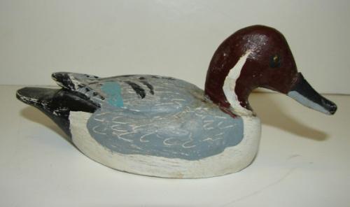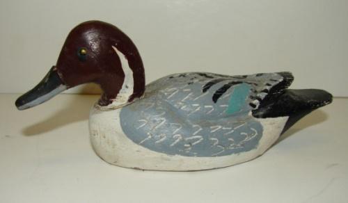 MINIATURE MILES HANCOCK, CHINCOTEAGUE, VIRGINIA PINTAIL DRAKE DECOY. Shows minor loss to paint. Signed on bottom. 5.5” L