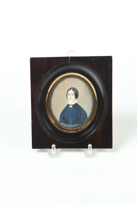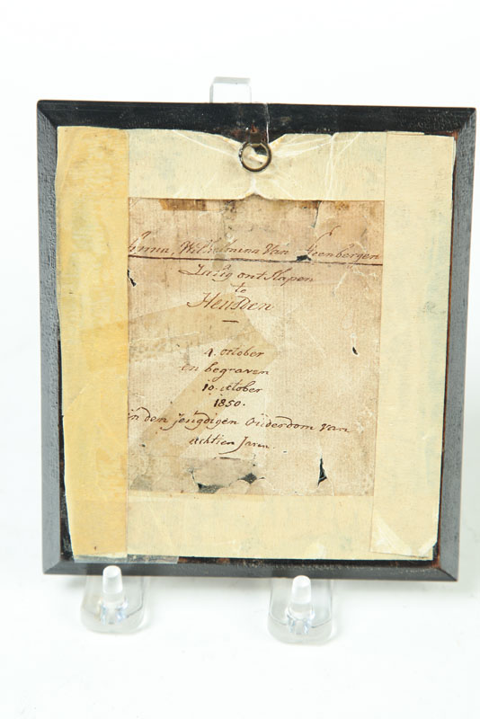European, mid 19th century. Woman dressed in blue with a brooch. Inked label on the back with sitter's name Anna Wilhelmina Van --eenbergen. In a frame, 5 1/2"h. 5"w.
