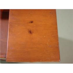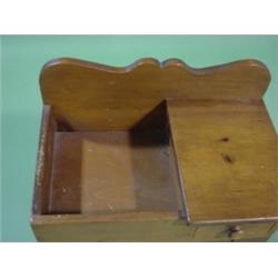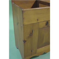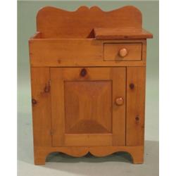 MINIATURE PINE CUSTOM MADE DRYSINK. Single raised panel door on bottom. Single drawer on top right. Cut-out base and shaped splash back. Surface scratching to top. 25.25" H, 22" W, 14" D